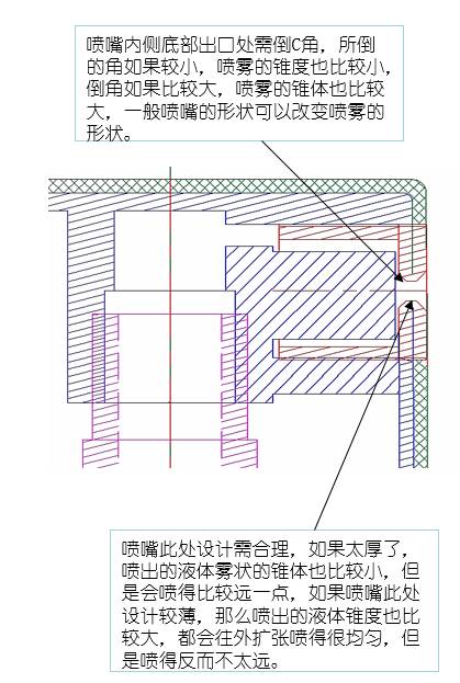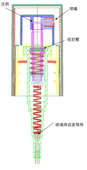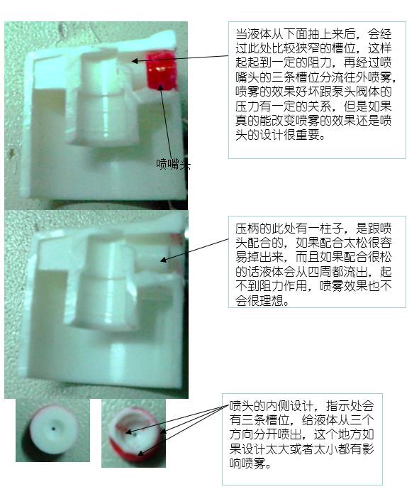 从上面的工作原理来看,一个好的泵头关键在以下几个地方特别注意:1、弹簧下的玻璃珠或者钢珠,此处的密封很重要,关系到弹簧腔体中液体往上冲的力度,如果此处泄漏当按下压柄时液体就会有部份往瓶子里面漏而影响液体往喷的效果;2、就是阀体上端的密封圈,此处如果泄漏,当压柄 放开时液体往上抽的力底减小,而造成阀体储存的液体量很少,也会影响到喷雾效果;3、压柄与阀芯处的配合,此处配合如果较松有泄漏的话,当液体往上冲到喷嘴处时会有一定的阻力,液体会往回流,如果此处泄漏也会影响喷雾效果;4、喷嘴的设计,喷嘴的设计好坏直接关系到喷雾的效果,详见下页详细讲解喷嘴设计问题;